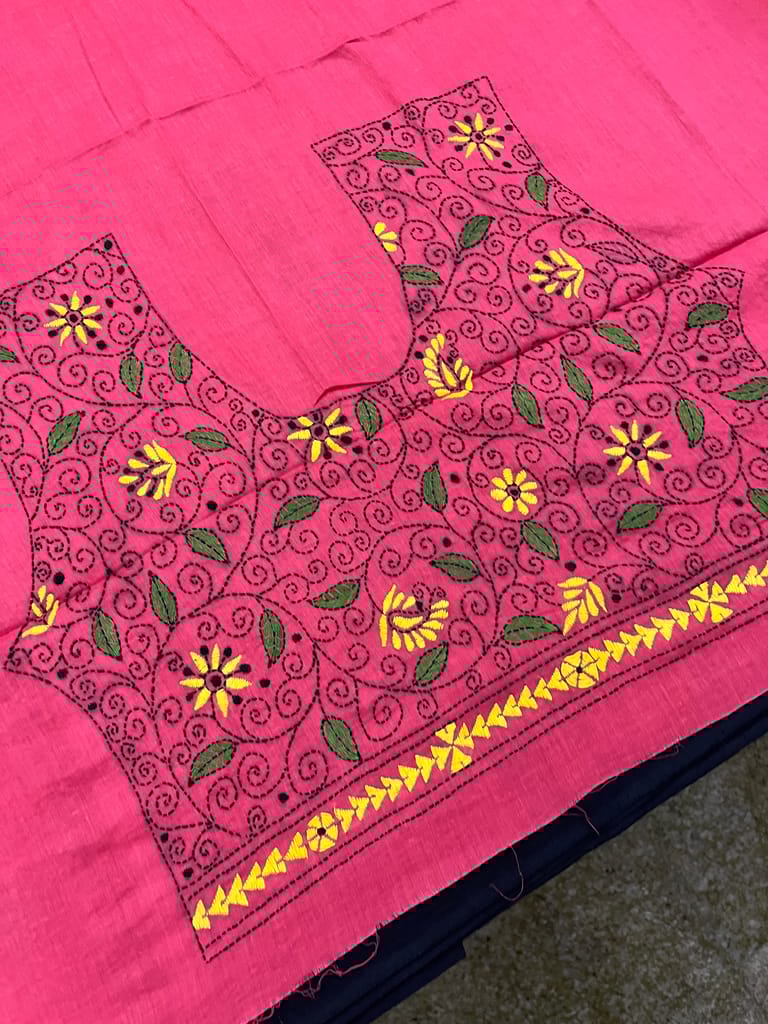 Kanthawork Blouse Piece is Intricately Handembroidered on the Back Neck area and Sleeves.